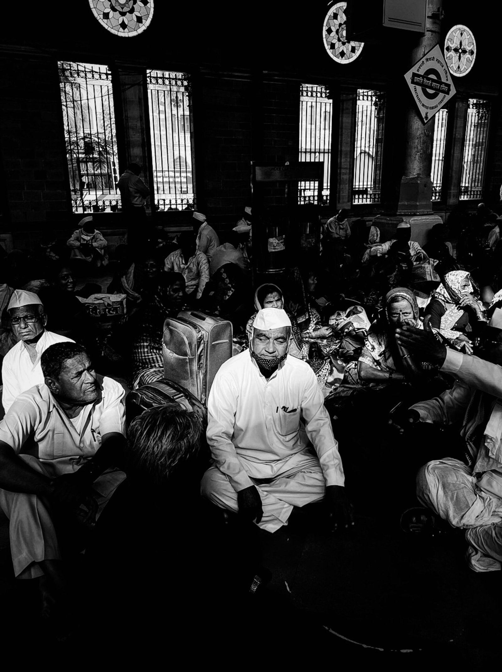 This black-and-white photograph portrays travelers gathered in a bustling railway station, surrounded by their belongings. The light streaming through tall windows illuminates their faces, capturing a mix of anticipation, fatigue, and quiet reflection. The image beautifully conveys the rhythm of everyday journeys and the shared emotions that connect people in moments of waiting.