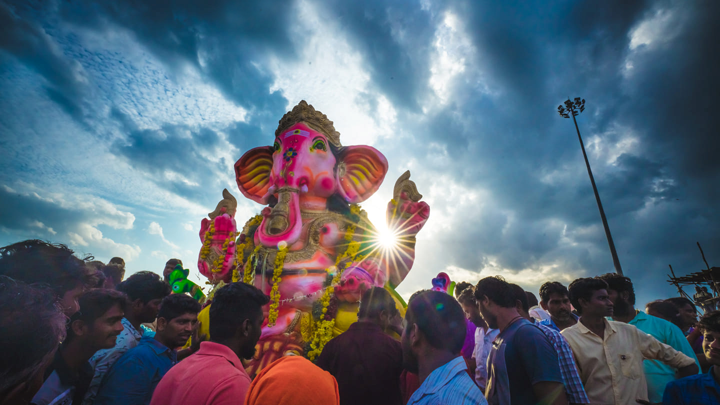 This photo beautifully captures the grandeur and spirit of the Ganesh Chaturthi festival. The vibrant idol of Lord Ganesha stands tall against a dramatic sky, with rays of sunlight peeking through — symbolizing hope, divinity, and new beginnings. The crowd gathered around reflects the sense of community and devotion that defines this celebration.