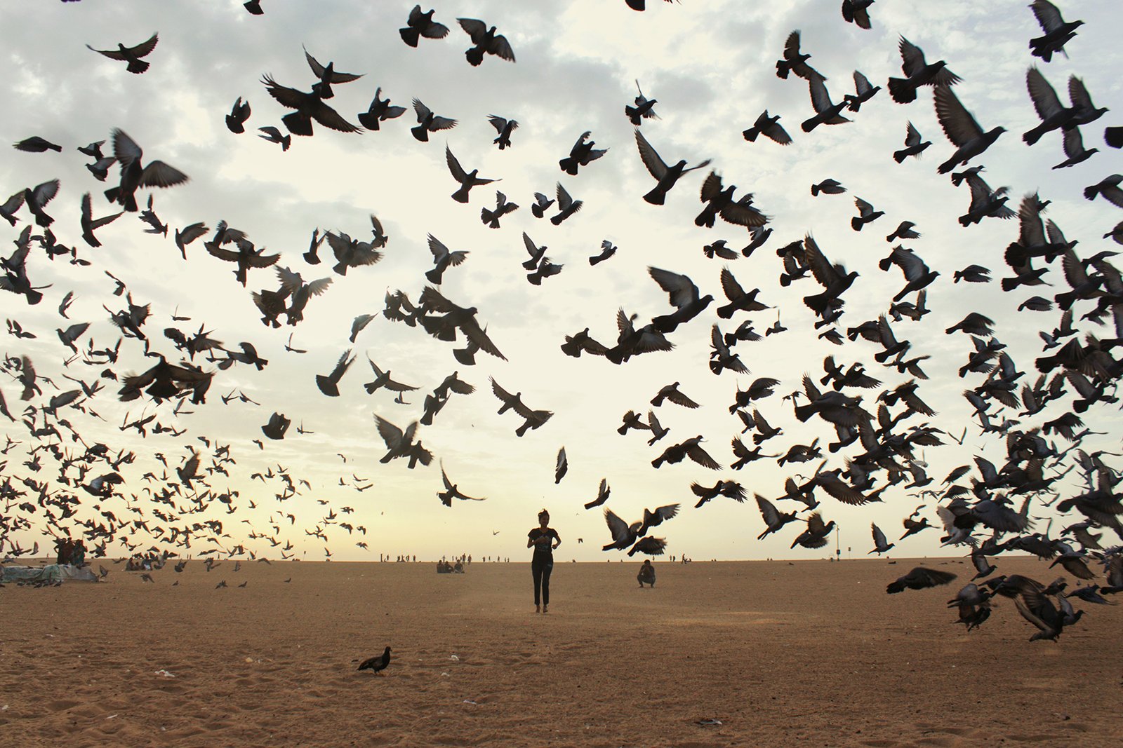 This striking photograph captures a moment of freedom and motion as a flock of pigeons takes flight across a vast, open beach. The lone figure standing in the distance against the golden sky adds a sense of solitude and wonder, evoking themes of peace and connection with nature. The balance between stillness and chaos — the person grounded amidst the flurry of wings — creates a powerful visual harmony.